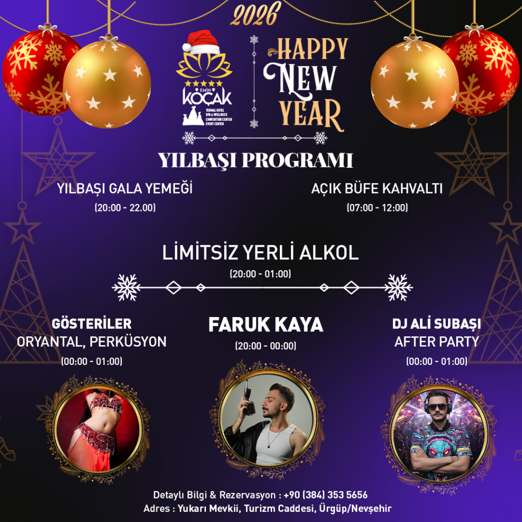 Bu özel gecede, akşamın ilk saatlerinden itibaren sizi muhteşem anlar bekliyor. Lezzet dolu bir gala yemeğiyle başlayan etkinliğimizde, usta şeflerimizin hazırladığı enfes tatlar damaklarınızı şenlendirecek. Sınırsız yerli alkol ve soft içecek serviside cabası! Müziğin ritmiyle buluşacağınız bu gece, Faruk Kaya ve Armoni orkestrasının güçlü performansı sizi coşturacak. Ardından oryantal ve perküsyon gösterileriyle dansın ve büyüsüne kapılacaksınız. Geceye enerjik bir dokunuş katmak isteyenler için DJ Ali Subaşı’nın özel spinleriyle after party’miz sizi bekliyor. Konaklayan misafirlerimize özel olarak hazırlanan, usta ellerden çıkan açık büfe geç kahvaltımızla yeni yılın ilk kahvaltısında yine beraber olacağız. Bu büyülü geceye siz de davetlisiniz; yeni yıllık birlikte kutlayalım!